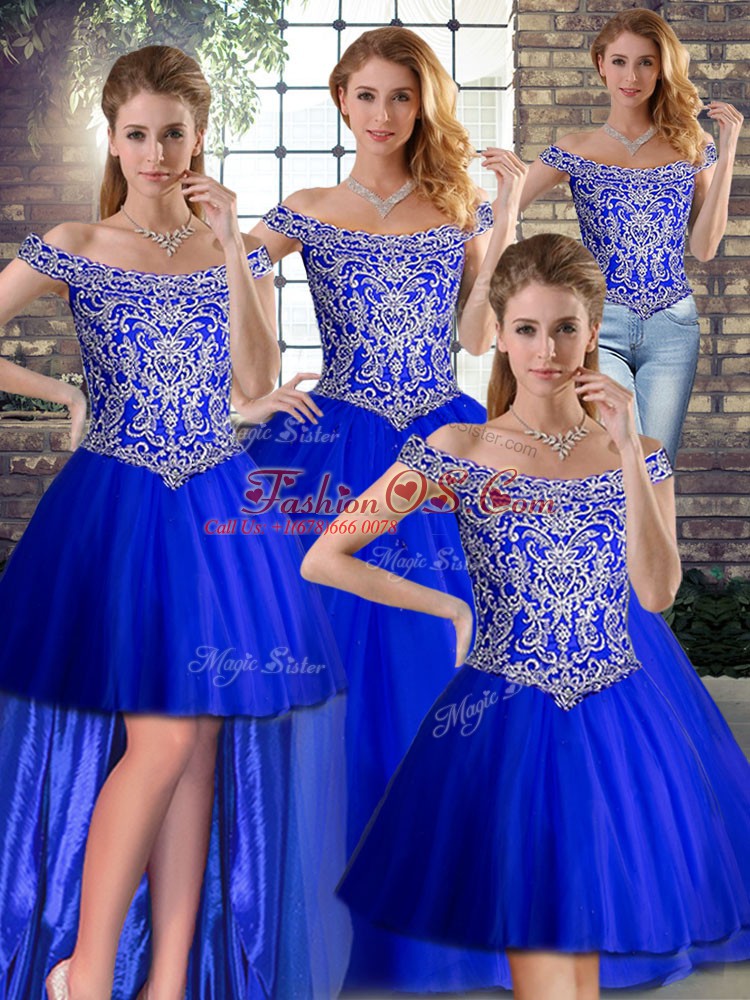 Home >  Quinceanera Dresses >  Detachable Quinceanera Skirts > Captivating Off The Shoulder Sleeveless Vestidos de Quinceanera Brush Train Beading Royal Blue Tulle