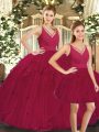 Captivating Red Ball Gowns V-neck Sleeveless Tulle Floor Length Lace Up Ruffles Sweet 16 Dress