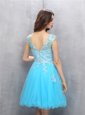 Silhouette: A-line Neckline: scoop Sleeve Length: cap sleeves Hemline/Train: knee length Back Detail: zipper Embellishment: beading,appliques Fabric: organza Shown Color: blue(Color & Style representation may vary by monitor.) Occasion: prom Season: spring,summer Fully Lined: Yes Built-In Bra: Yes