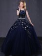 Captivating Scoop Cap Sleeves Vestidos de Quinceanera Floor Length Beading and Belt Navy Blue Tulle