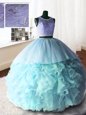 Captivating Three Piece Baby Blue Organza and Tulle and Lace Zipper Scoop Sleeveless With Train Ball Gown Prom Dress Brush Train Beading and Lace and Ruffles