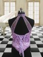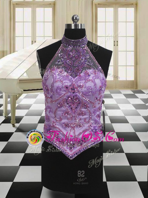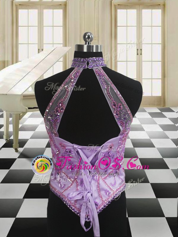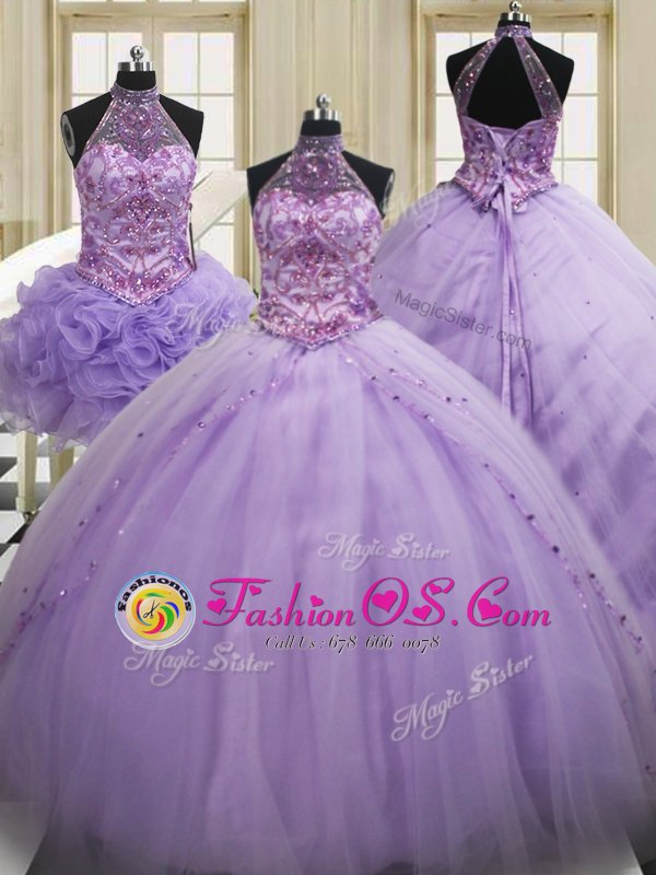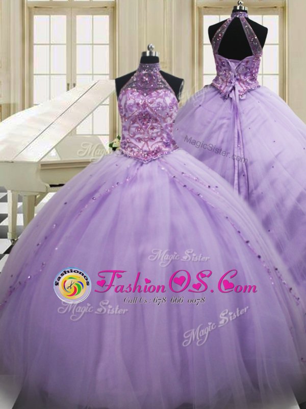 Captivating Three Piece Halter Top Sleeveless Sweet 16 Dresses Brush Train Sequins Lavender Tulle