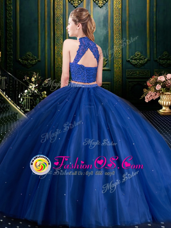 Captivating Two Pieces 15th Birthday Dress Navy Blue High-neck Tulle Sleeveless Floor Length Lace Up