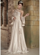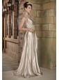 If you dream of being prom queen or queen of the homecoming court, this champagne stretch satin dress is sure to take you well on your way. It features a gorgeous one shoulder bodice with pleatings. The wide waistband encrusted with embroidery and beadings adds interest to the dress midsection and shows off your great figure at the same time. The floor-length skirt is sheer and thin, allowing it to flow when you move for a graceful look. Just a fabulous dress all around!