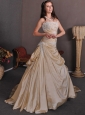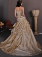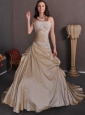 Champagne A-line Strapless Appliques Wedding Dress Chapel Train Taffeta