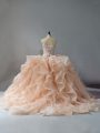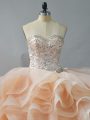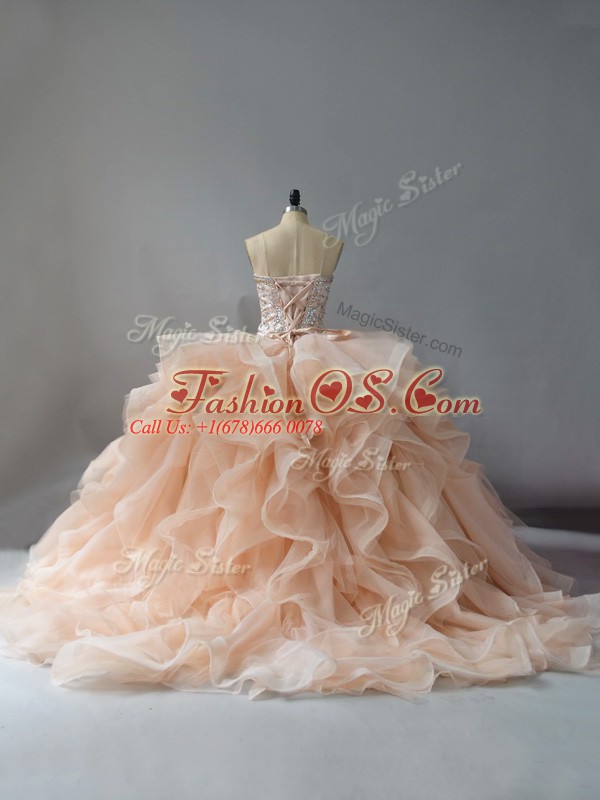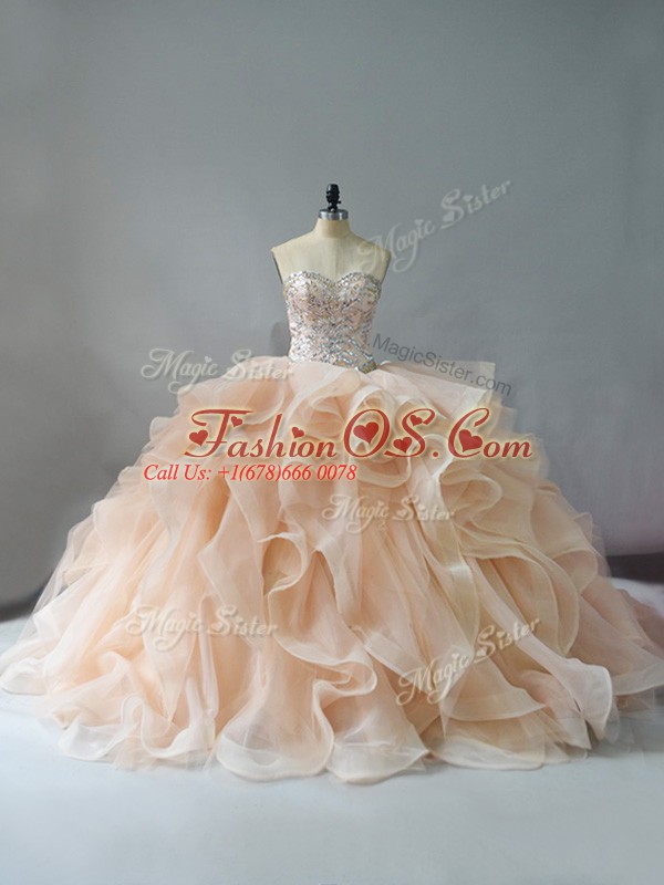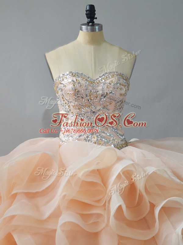 Champagne and Pink And White Ball Gowns Organza Sweetheart Sleeveless Beading and Ruffles Lace Up Quinceanera Dresses Brush Train