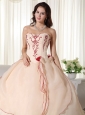 At the first sight of this sweetheart quinceanera dress, you'll fall in love with it. The highlighting view of this fabulous dress lies in the beautiful embroidery on the bodice and puffy skirt. The embroidery is so specially designed that gives the whole dress a perticularly wonderful view. Around the waist, two toned flowers decorate there and their tails flow down to the full skirt to make this dress more elegant and beautiful. The exquisite lace up back fits all figure as long as you want. This gorgeous gown is really the best choice for anyone who want to show her elegance and beauty.