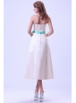 Champagne Bridemaid Dress With Turquoise Sash Tea-length Satin