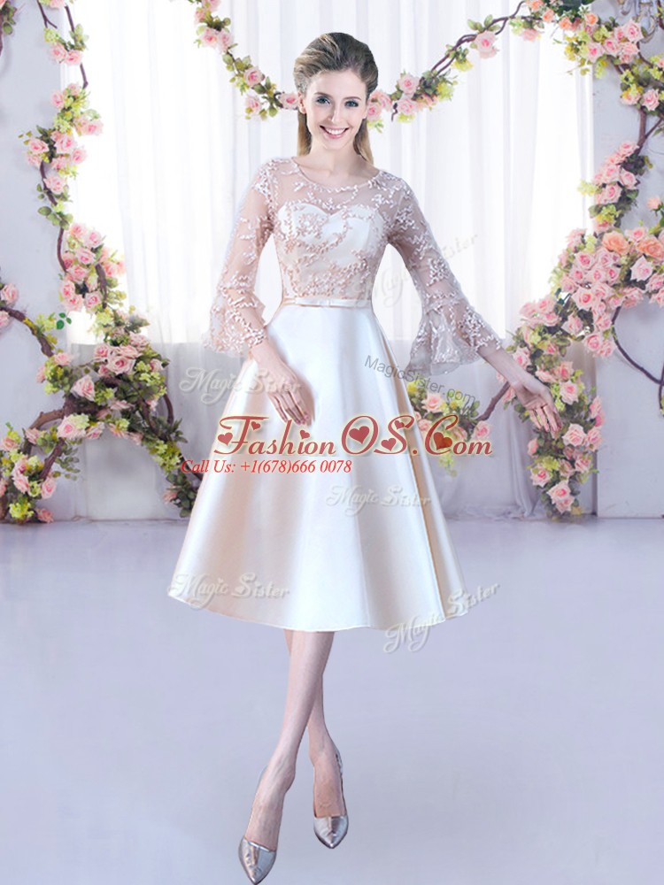 Home >  Bridesmaid Dresses >  Perfect Bridesmaid Dresses > Champagne Bridesmaid Dresses Wedding Party with Lace and Belt Scoop 3 4 Length Sleeve Lace Up