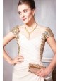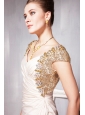 Shinning is the only word that comes in my mind when seeing the dress.The symmetrical gold crystals and sequinces on both sides of the sweetheart neckline bodice with a gathering at the waist, which contours your figure.Besides, the side pleats serve as a foil to the flat and flowing skirt in the front part.A hidden zipper secures the dress and completes the look.
