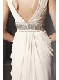 You will be ready for your red carpet moment when you slip into this magnificent prom dress. the V-shaped neckline plunges to the waist. The back is open. Twinkling, multicolored beads brighten up the broad waistband, and the skirt sweeps to the floor in long, lustrous layers.