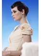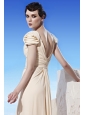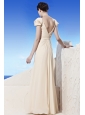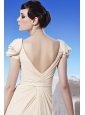 Wearing this dress will surely make you be impressive. The fashionable champagne prom dress features a V-neck and has a ruched bodice. The cap sleeves are adorned with rosettesand the waist is accented with a waistband. The open back will make you very sexy. You will never be regret in choosing this dress.