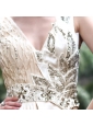 A sexy V-like strap prom attracts countless of appreciated eyes. The bodice is the most important merit of the dress. It is completed with fine workmanship and delicate design.One shoulder side of the bodice is decorated with scaly details while another side is difined with leaf-shape decoration encrusted with shinning beads. The waistband is also in a asymmetrically shap to get a unique design.The skirt is simple with the feeling of elegant and soft.