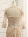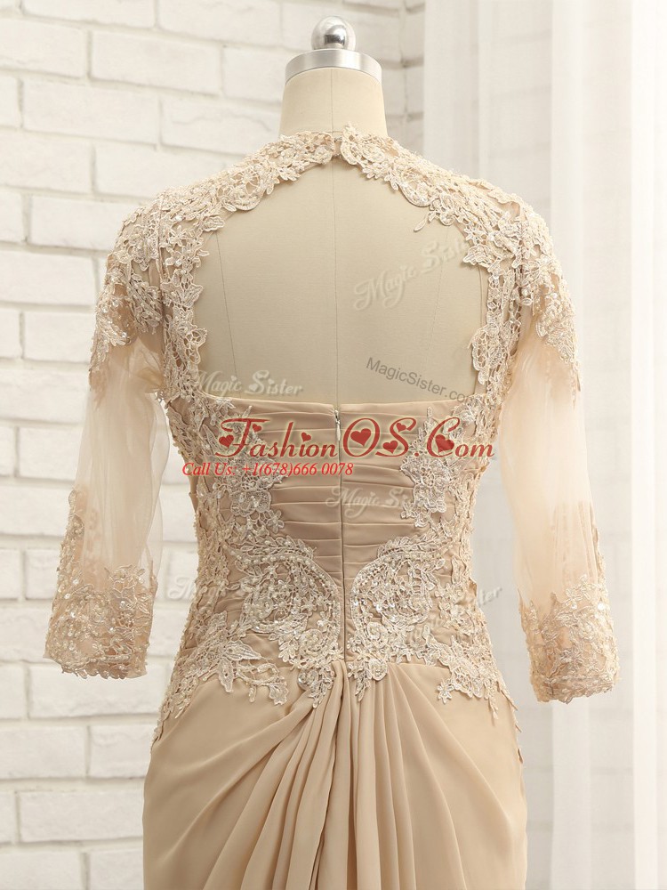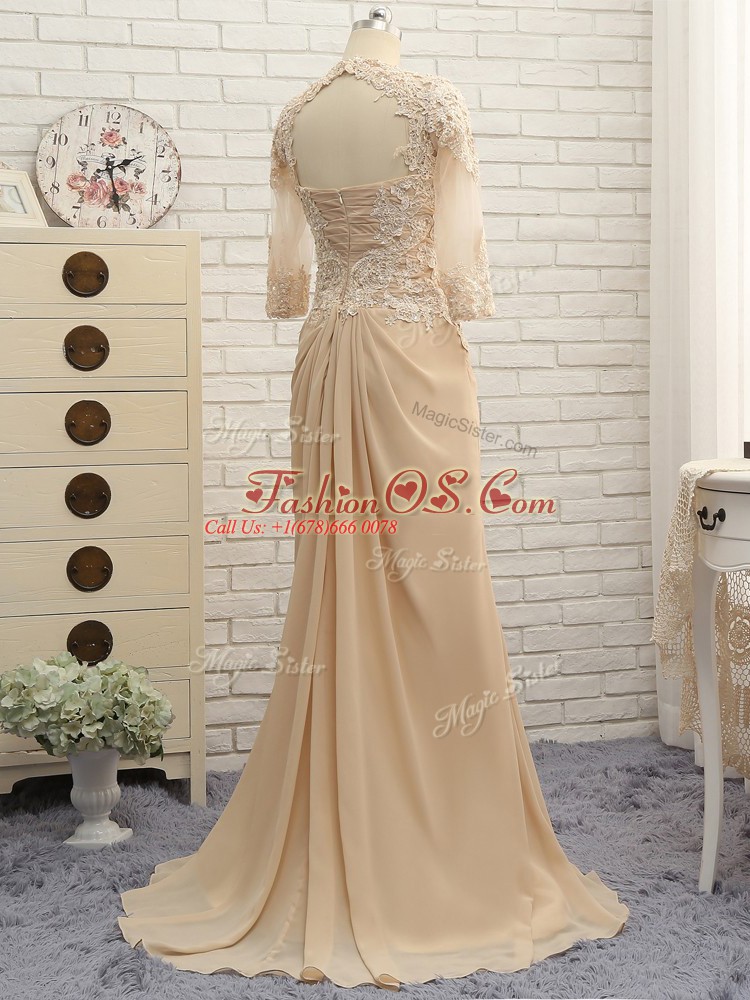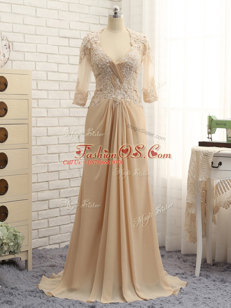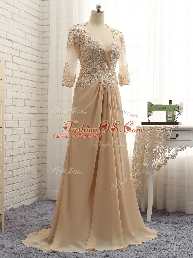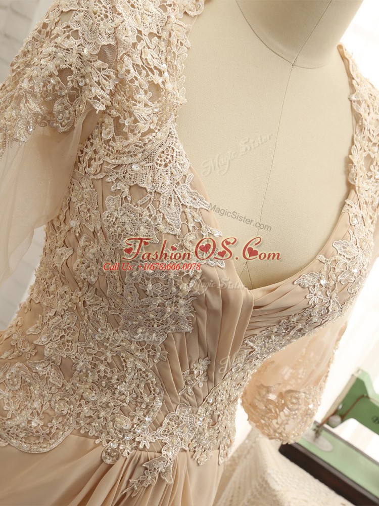 Champagne Mother Of The Bride Dress Chiffon Brush Train Long Sleeves Beading and Lace and Appliques