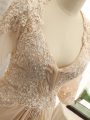 Home >  Special Occasion Dresses >  Elegant Mother of the Bride Dresses > Champagne Mother Of The Bride Dress Chiffon Brush Train Long Sleeves Beading and Lace and Appliques