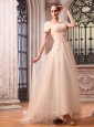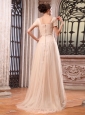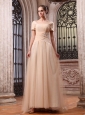 All eyes will definitely be on you in this stunning evening gown. It has so many design elements that we don't even know where to begin describing it! The champagne Wedding Dress has a batteau neckline, two short sleeves and a ruched bodice. A hidden zipper makes for easy off and on and secures the dress in place.