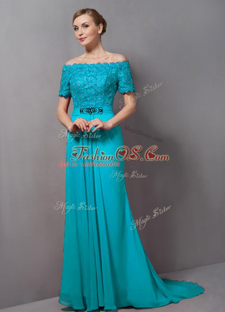 Charming Aqua Blue Mother Of The Bride Dress Off The Shoulder Short Sleeves Sweep Train Zipper
