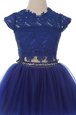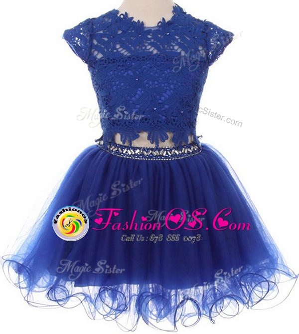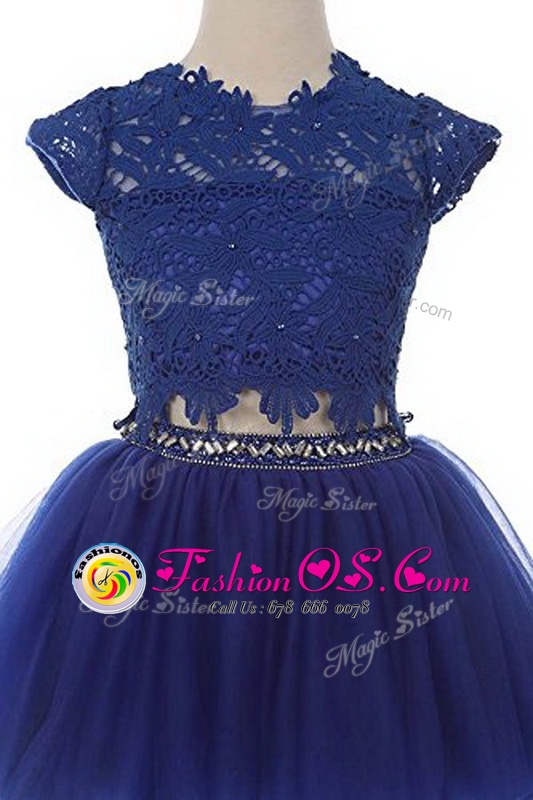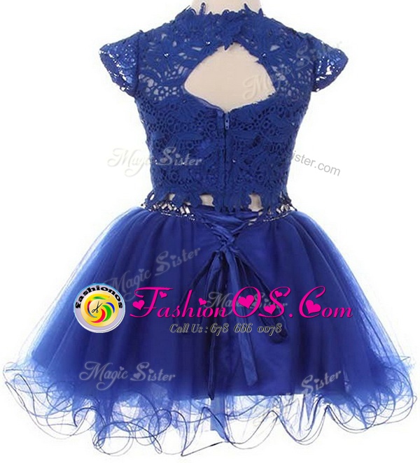 Charming Scoop Cap Sleeves Mini Length Beading and Lace Zipper Flower Girl Dress with Blue