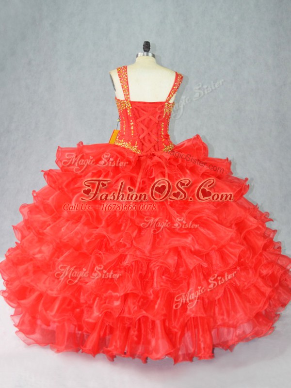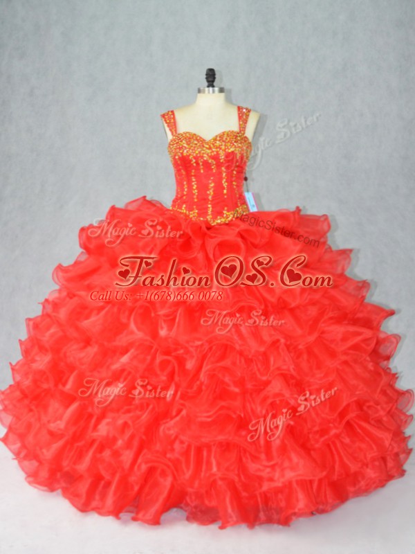 Charming Sleeveless Floor Length Beading and Ruffles Lace Up Quince Ball Gowns with Red