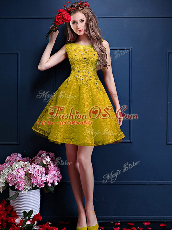 Charming Sleeveless Knee Length Beading and Lace Lace Up Quinceanera Court of Honor Dress with Yellow