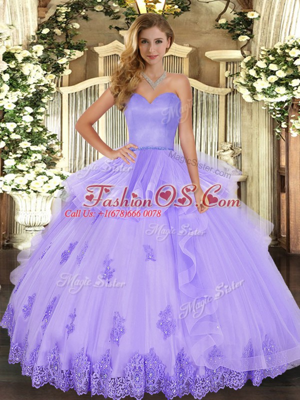 Home >  Quinceanera Dresses >  In Stock Quinceanera Dresses > Charming Sleeveless Tulle Floor Length Lace Up Quinceanera Dress in Lavender with Beading and Appliques and Ruffles