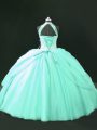Cheap Apple Green Tulle Lace Up Halter Top Sleeveless Floor Length 15th Birthday Dress Beading