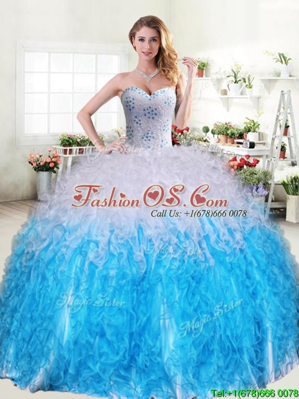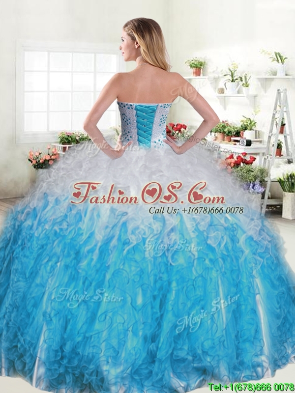 Cheap Beaded and Ruffled Quinceanera Dress in Blue and White