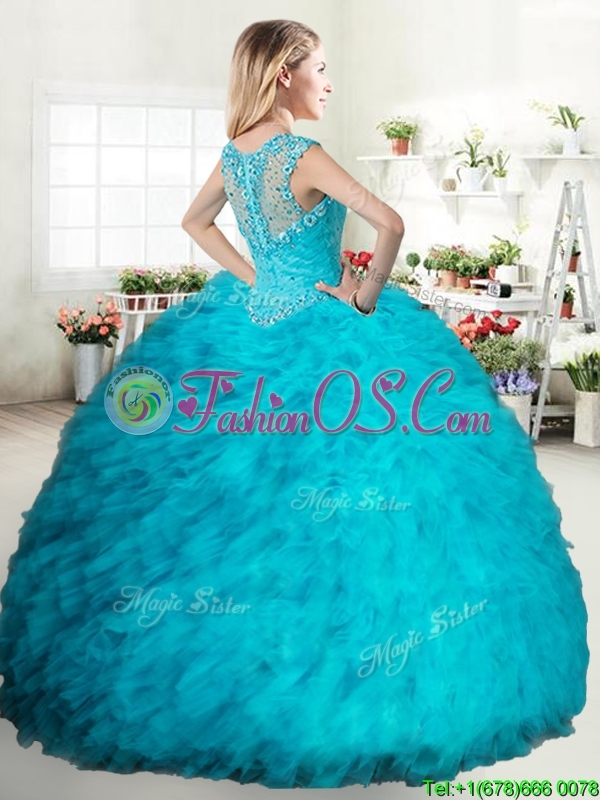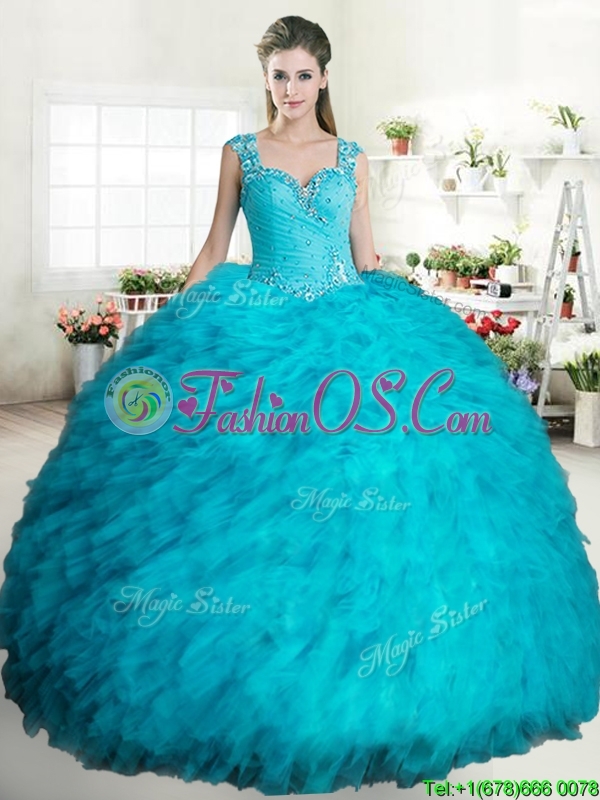 Cheap Beaded and Ruffled Turquoise Quinceanera Dress in Tulle