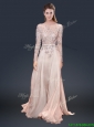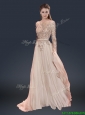 Cheap Brush Train Champagne Modest Prom Dresses with Beading