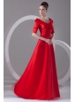Home >  Prom Dresses >  Beautiful Prom Dresses > Cheap Column V-neck Red Taffeta Half Sleeves Red Ruching Prom Dress