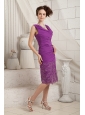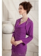 Stunning and sophisticated are two words to perfectly describe this purple prom dress. It features heavlily pleated bodice with two wide shoulder straps. The fitted bodice has a slightly dropped neckline and natural waist. The knee-length skirt is adorned by intricate appliques which spreads till the hem. A hippen zipper ensures a perfect fit and makes for easy on and off. This dress has a matching jacket which is also embelished by delicate embroidery and shimmery beads. You will sure to love it.