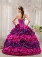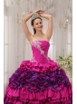This fushia and purple strapless floor length quinceanera gown is your perfect choice to attend any party!It features a lovely gathered pattern at the top that adds lots of textured details. Floral appliques further decorate the bodice . The amazing skirt is made of several layers of ruffles and large fabric roses. The dress sways beautifully across the floor when you move, as if you're floating on air. A lace up corset style closure in the back completes the dress.