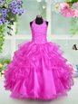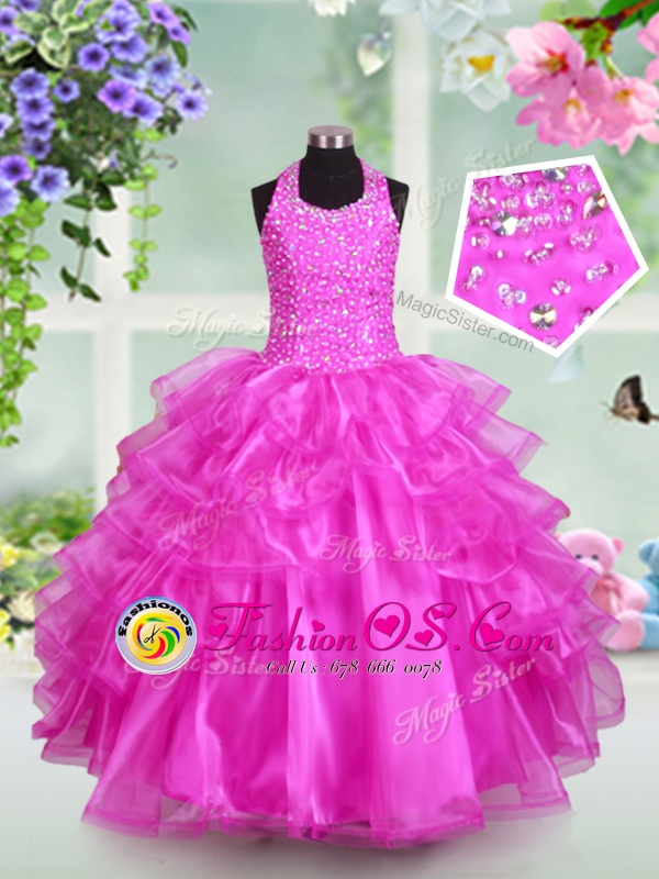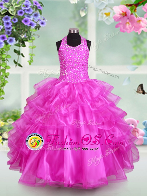 Cheap Halter Top Fuchsia Sleeveless Beading and Ruffled Layers Floor Length Kids Pageant Dress