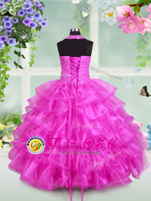Home >  Special Occasion Dresses >  Mini Quinceanera Dresses > Cheap Halter Top Fuchsia Sleeveless Beading and Ruffled Layers Floor Length Kids Pageant Dress