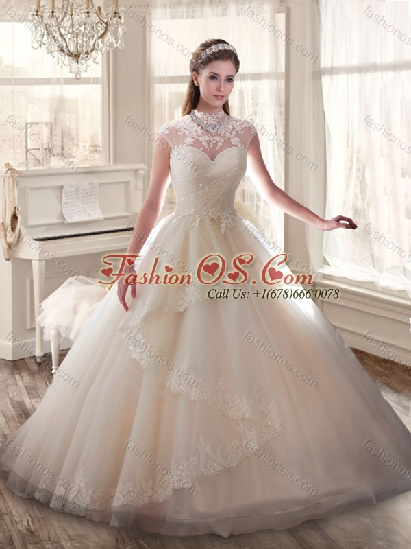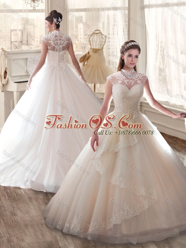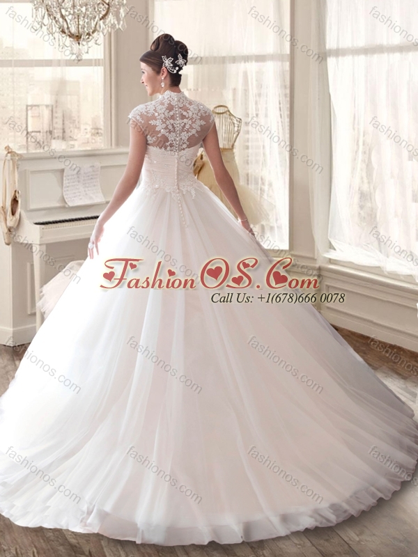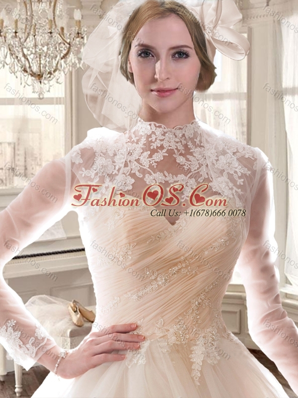 Cheap High Neck Wedding Dresses with Appliques and Ruching