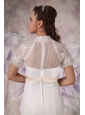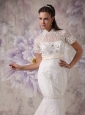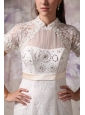 Dramatic and glamorous! This gorgeous white wedding dress will leave you a last long wonderful memory for sure! The subdued bodice is encrusted with a high neck, dainty laces and exquisite beadwork all over the skirt. The sassy sleeves just looks like a matching jacket, while the chic sash is so unique that can conture your natural figure. The floor length mermaid style skirt with stunning embellishment adds more elegance to create a beautiful court train in the back. A lace up corset style closure in the back secures the dress in place and completes this fabulous design!