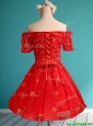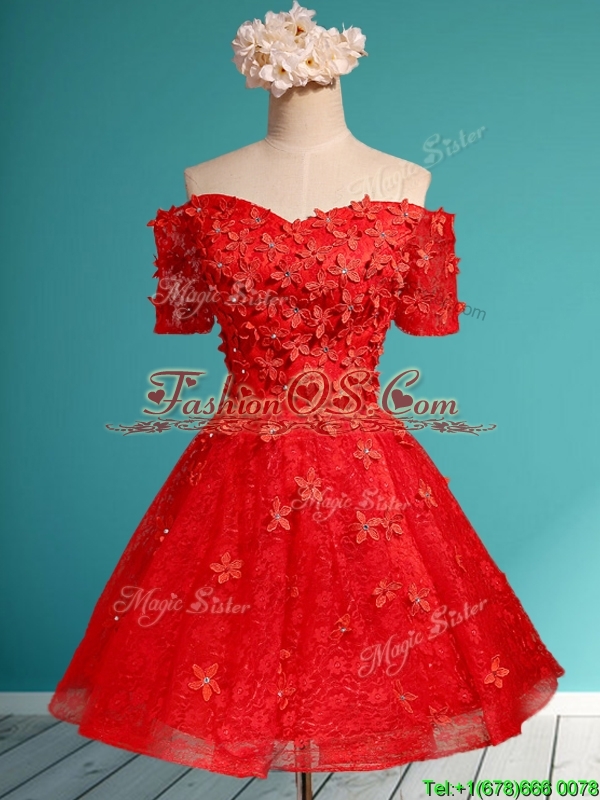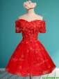 Cheap Off the Shoulder Short Sleeves Prom Dress with Appliques and Beading
