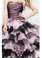 Silhouette:Ball Gown Neckline:One Shoulder Waist:Natural Hemline/Train:Floor-length Sleeve Length:Sleeveless Embellishment:Ruffled Layers,Hand Made Flower Back Detail:Lace-up Fully Lined:Yes Built-In Bra:Yes Fabric:Organza Shown Color:Black and Pink(Color & Style representation may vary by monitor.) Occasion:Military Ball, Sweet 16, Graduation, Quinceanera Season:Spring, Summer, Fall, Winter