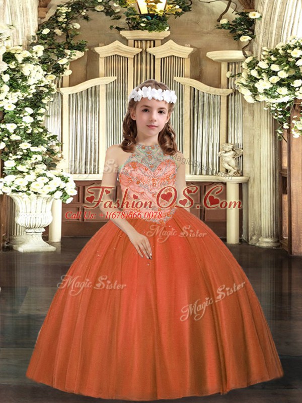 Home >  Special Occasion Dresses >  Pretty Little Girl Pageant Dresses > Cheap Rust Red Ball Gowns Tulle Halter Top Sleeveless Beading Floor Length Lace Up Girls Pageant Dresses