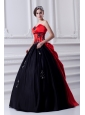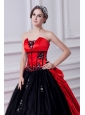 Home >  Quinceanera Dresses >  Luxurious Quinceanera Dresses > Cheap Strapless Appliques Pick-ups Black and Red Quinceanera Dress with Brush Train