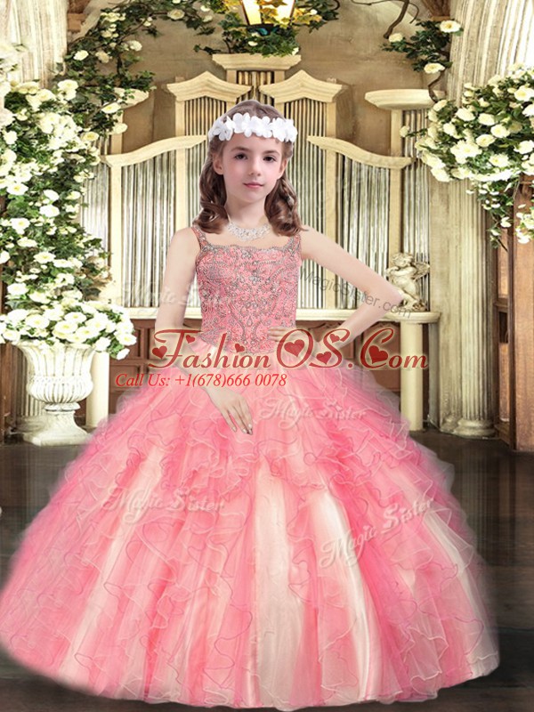 Home >  Special Occasion Dresses >  Lovely Little Girl Pageant Dresses > Cheap Watermelon Red Tulle Lace Up Little Girl Pageant Dress Sleeveless Floor Length Beading and Ruffles