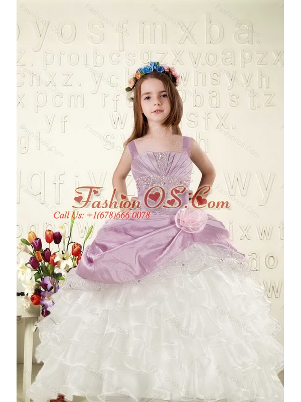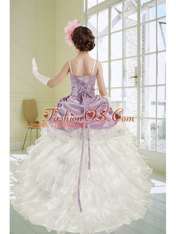 Home >  Special Occasion Dresses >  New Style Little Girl Pageant Dresses > Cheap White and Lavender Little Girl Dress with Appliques and Ruffled Layers