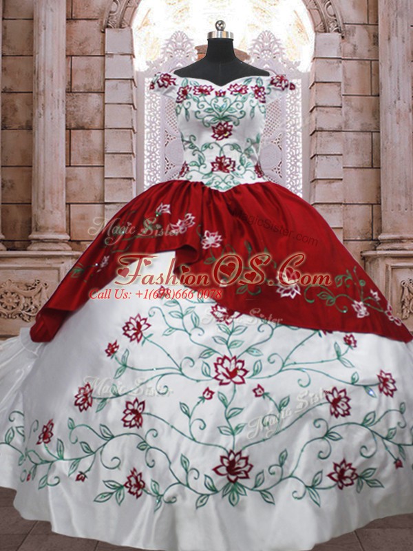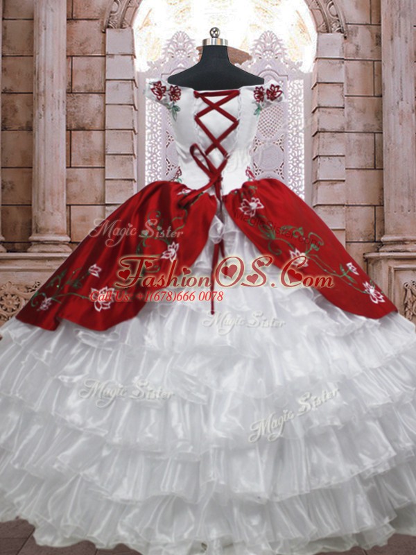 Home >  Quinceanera Dresses >  Fast Delivery Quinceanera Dresses > Cheap White And Red Sleeveless Floor Length Embroidery and Ruffled Layers Lace Up 15 Quinceanera Dress