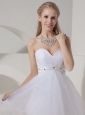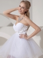 A sassy notable prom dress features with a strapless sweetheart neckline dress. The appliques decorated on the bodice add the exquisite charm. A mini-skirt formed by muti-tiered tulle give you a flowy and sausy feeling.A lace up back add the elegant and sexy look of the dress. Wearing this dress, your slim leg and bare shoulder show off your feminine beauty. This pure lovely dress is just your best choice.