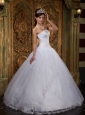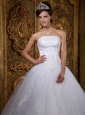 Elegant is the word to written the white strapless wedding dress.Strapless dresses are one of the sexier styles on the market today. They show just enough skin to be classy without being too revealing. Appliques defines the bodice and scatted asymmetrically on the ball gown. A lace up corset style closure in the back secures the dress in place. Layers of tulle give you the feelling of smooth and soft.