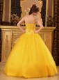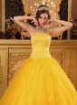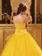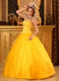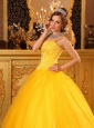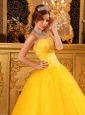 Are you joining in the party? Do you want to be the focus point? But now, the chance is coming for this elegant yellow quinceanera dress. The fitted bodice heavily embellished with shining beading and rhinestones accentuates your curve perfectly. The added two spaghetti straps adorned with shimmery beadings enhances your femininity nicely while the lovely skirt is highlighted with exquisite appliques. A lace up completes the look.