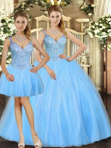 Chic Baby Blue Lace Up Straps Beading Ball Gown Prom Dress Tulle Sleeveless
