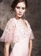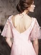 Chic Baby Pink Chiffon Zipper Evening Dress Half Sleeves Floor Length Lace and Appliques