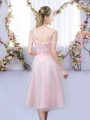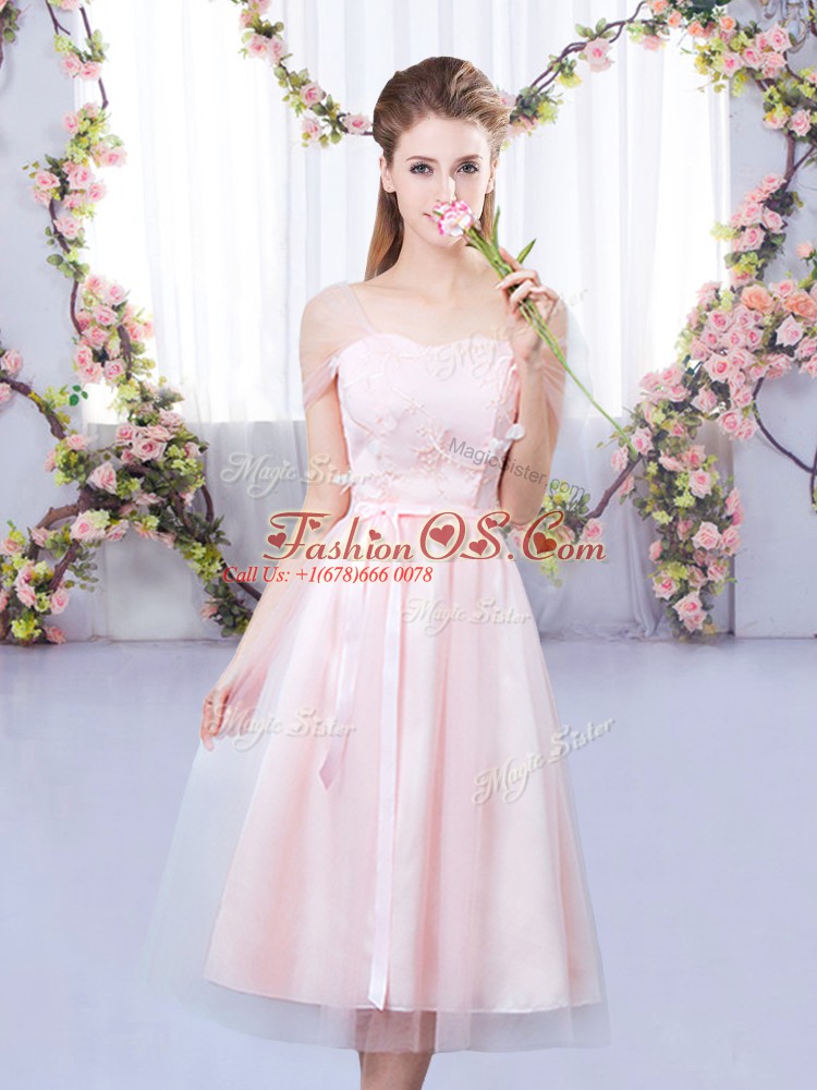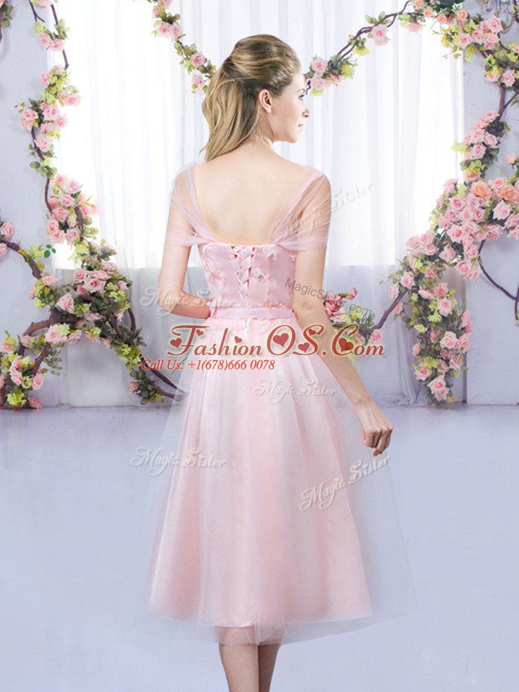 Home >  Bridesmaid Dresses >  Perfect Bridesmaid Dresses > Chic Baby Pink Tulle Lace Up Wedding Guest Dresses Short Sleeves Tea Length Lace and Belt