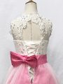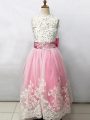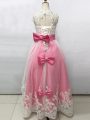Chic Pink And White Sleeveless Floor Length Beading and Lace and Bowknot Lace Up Flower Girl Dresses for Less